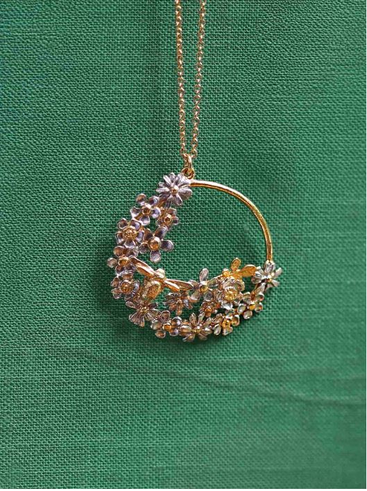 A tiny Bumblebee seeks nectar from a loop of spring flowers, in our bee-loved Posy Bloom Necklace! Alex Monroe Jewellery is inspired by nature and handcrafted in our London Workshop.