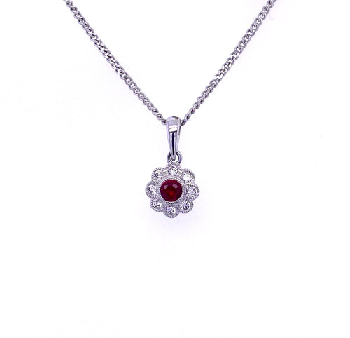 18ct White Gold, Ruby & Diamond Daisy Cluster Pendant