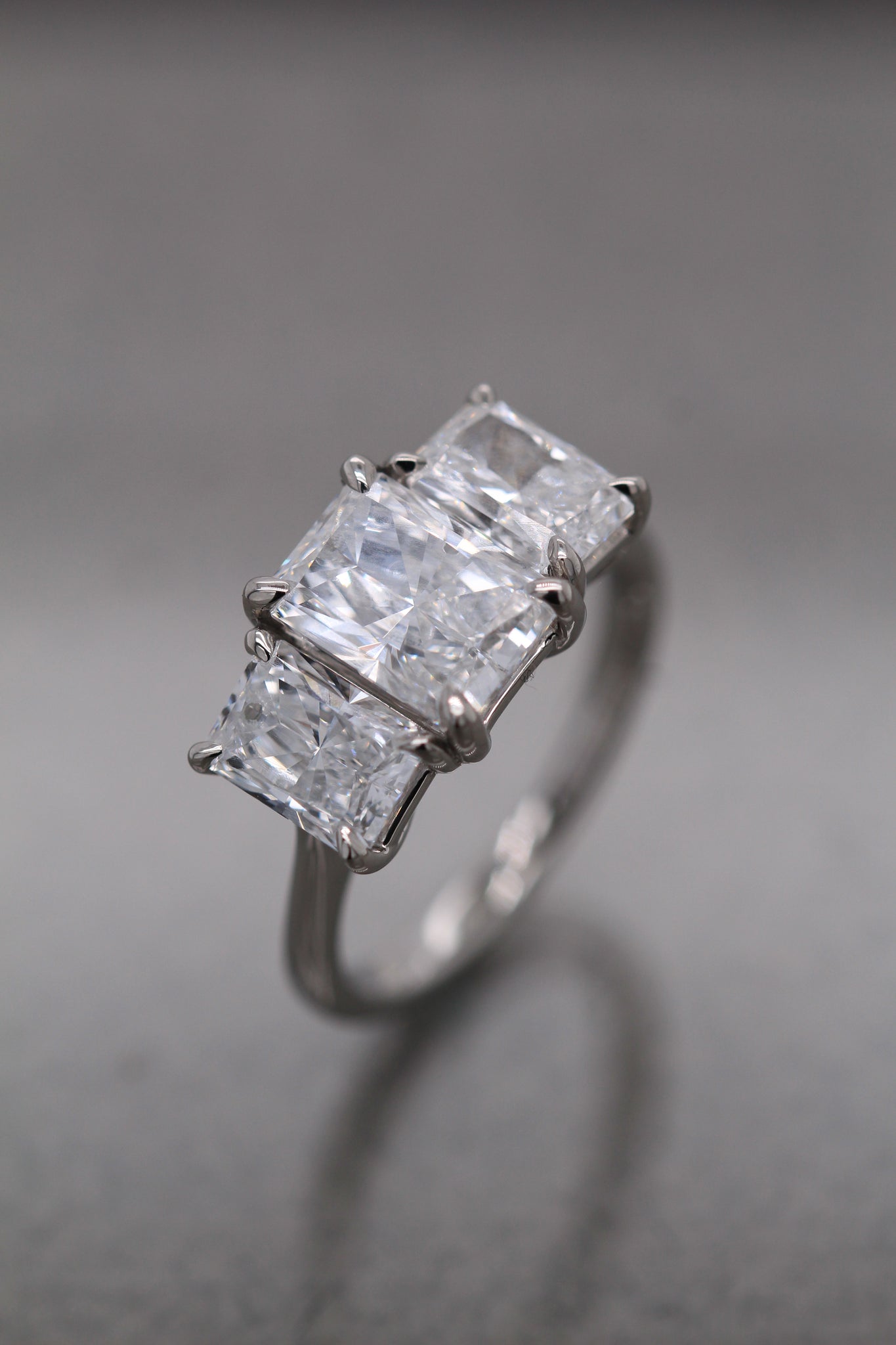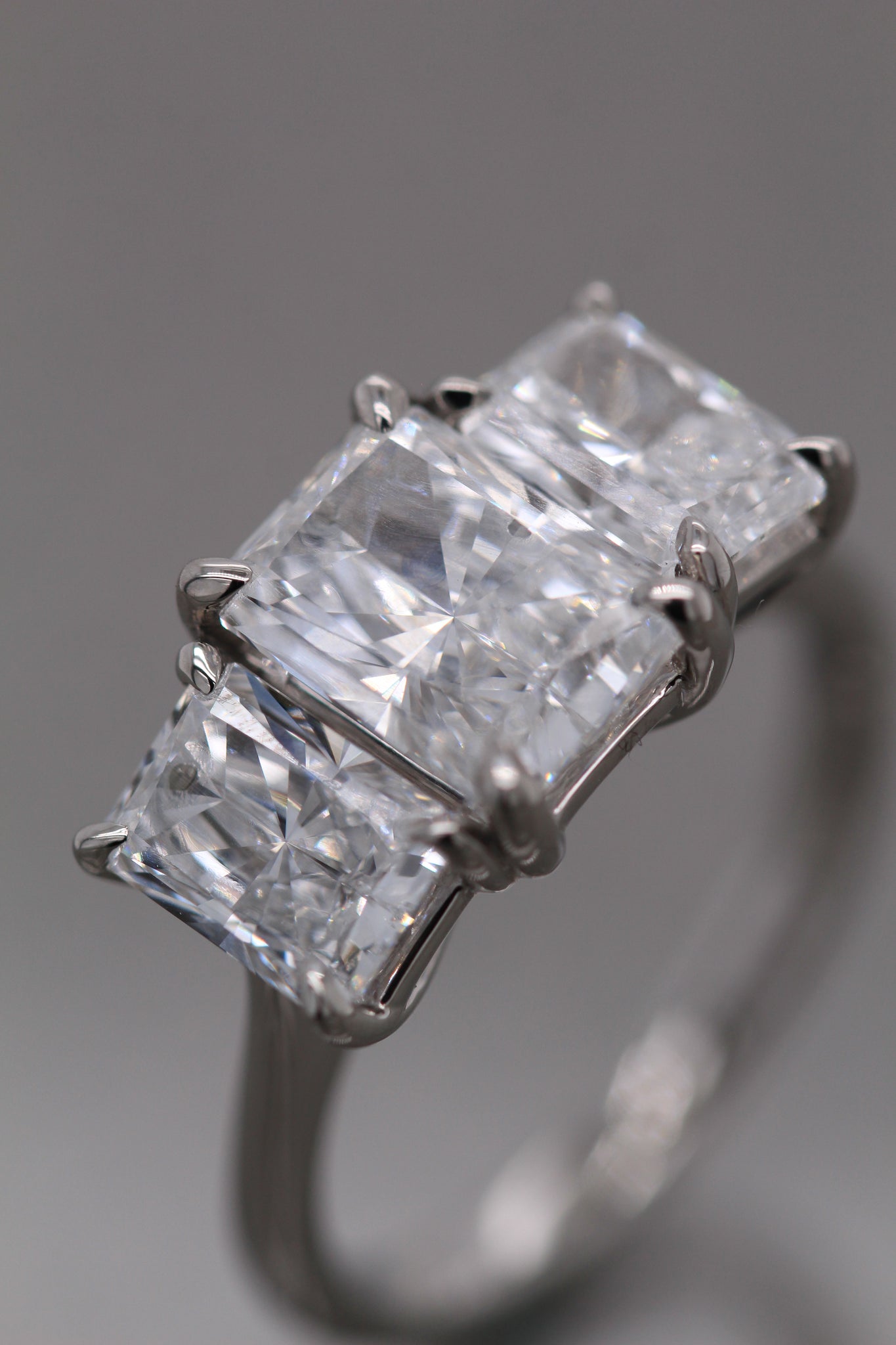 A showstopping laboratory grown diamond engagement ring, expertly crafted in platinum. This trilogy ring features a total 4.18ct, radiant-cut laboratory grown diamonds. Set in refined talon-claw settings, these diamond dazzle. The central diamond has an exceptional D colour and VS1 clarity. The side diamonds both have a D colour and excellent VVS2 clarity. All the diamonds are accompanied by an IGI laboratory grown diamond certificate (International Gemological Institute).