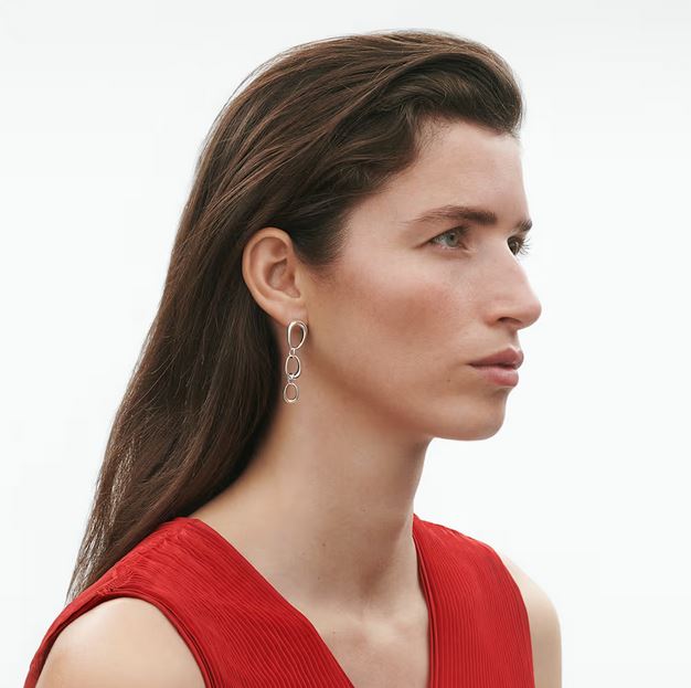 A trio of sterling silver loops form this refined set of earrings by jewellery designer Jacqueline Rabun. Her work is often imbued with profound symbolism and the interconnected egg-shaped rings that form these subtly sculptural pieces represent the emotional ties that bind together human relationships.