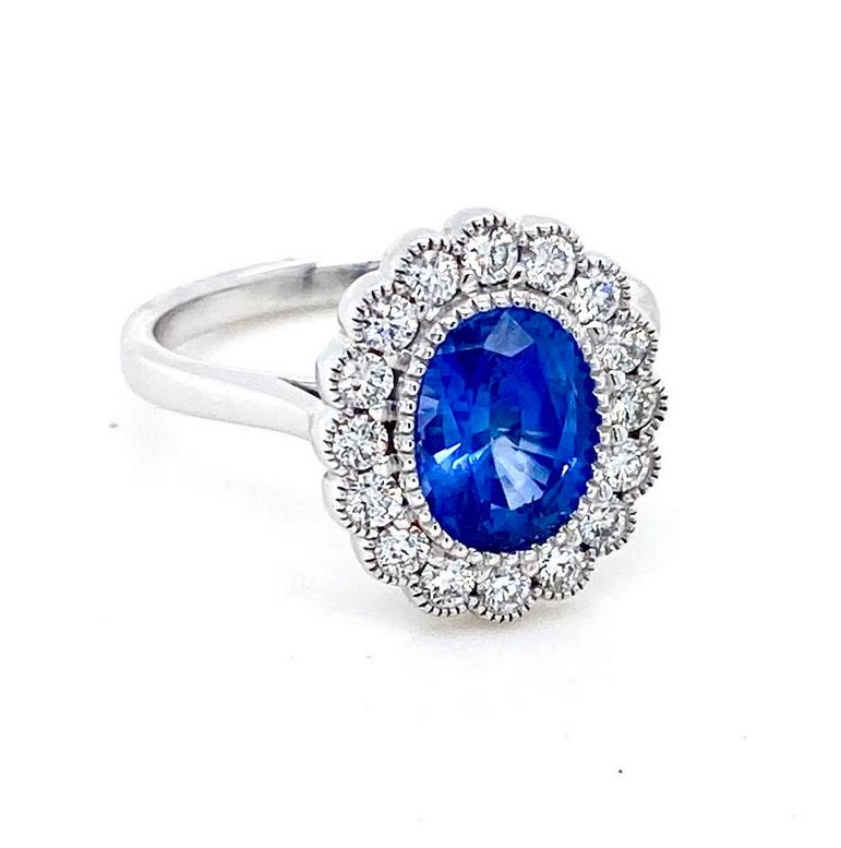 A showstopping sapphire and diamond cluster ring. This ring combines modern craftsmanship with classic traditional design. Set with a sumptuous 1.45ct oval sapphire its striking blue hue is every sapphire lover's dream. This sapphire is surrounded by a dazzling halo of brilliant-cut diamonds. Adding an extra flare, they are set in a decorative scalloped setting with fine milgrain detailing. They have a total carat weight of 0.40ct with a rare white colour G and SI1 clarity.