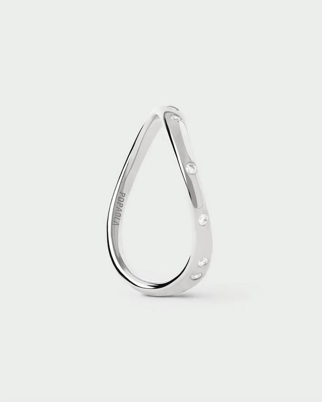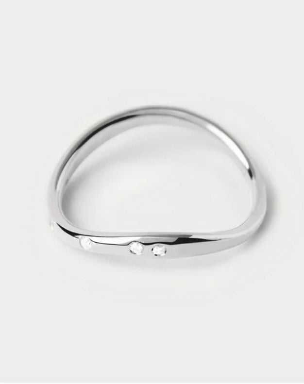 Sleek silver ring with set with sparkling zirconia and fluid lines.