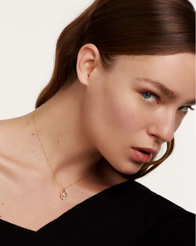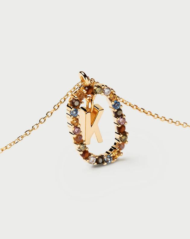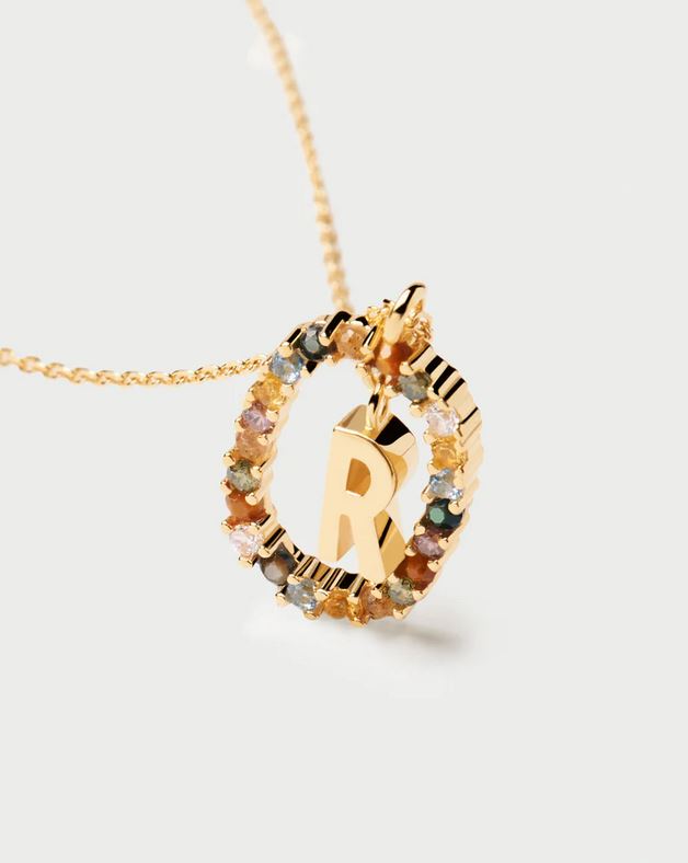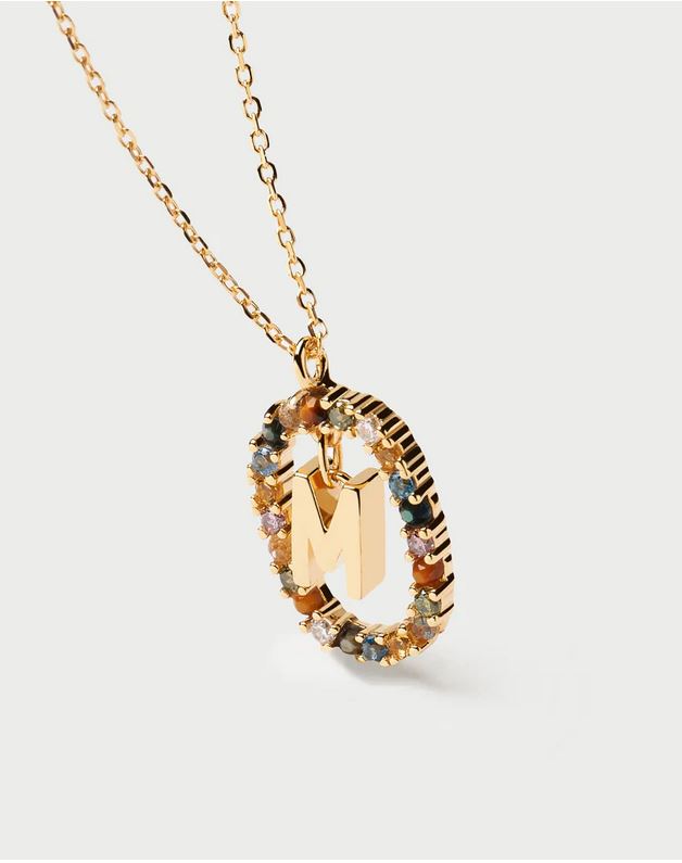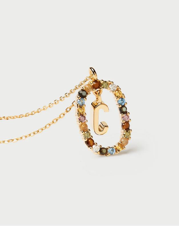 Initial necklaces in gold-plated silver, circled by colorful gemstones.