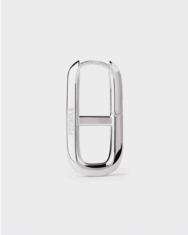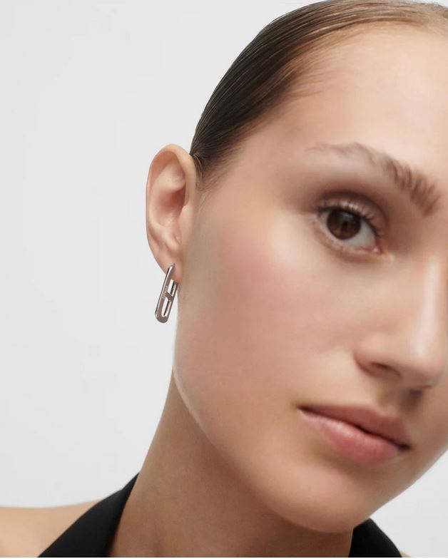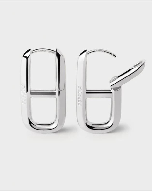 Silver geometric oval hoop earrings with horizontal crossbar.