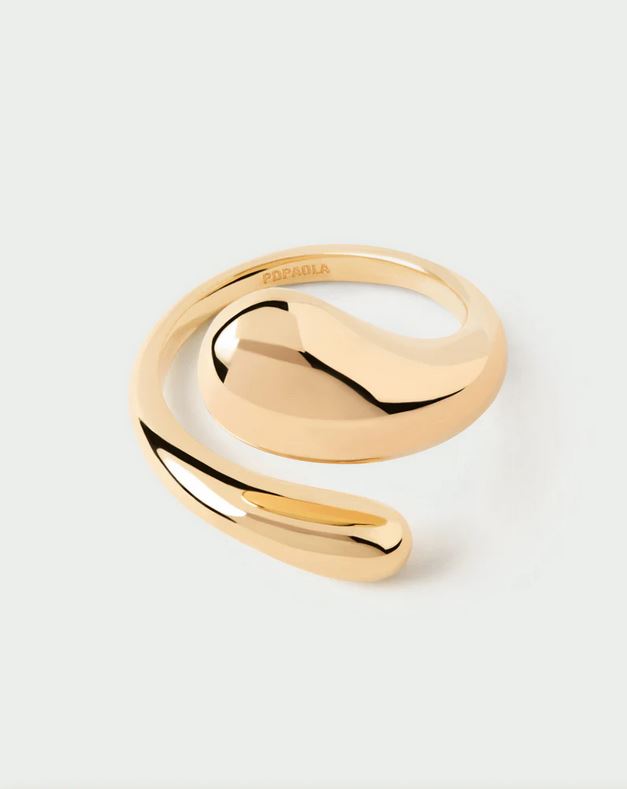 Gold-plated sculptural bypass ring with an eloganted drop shape.