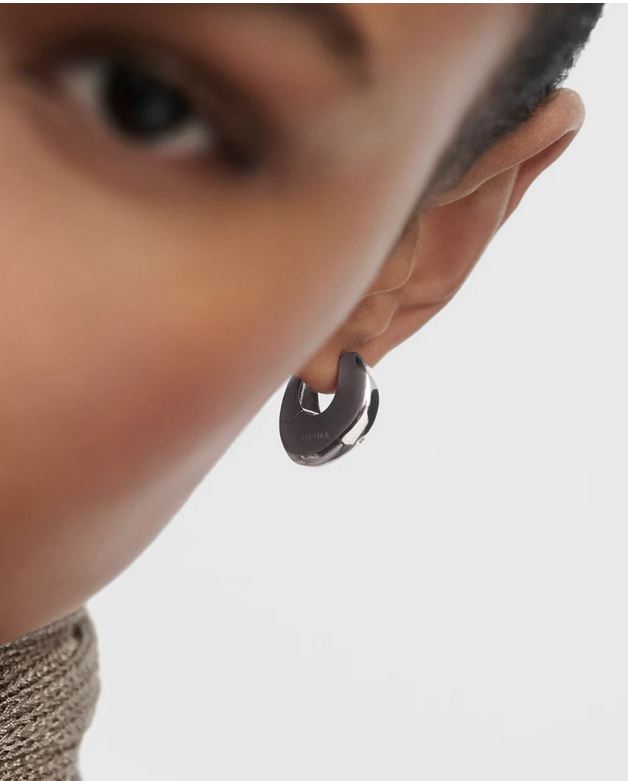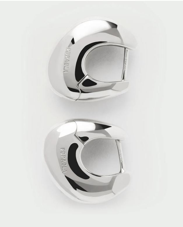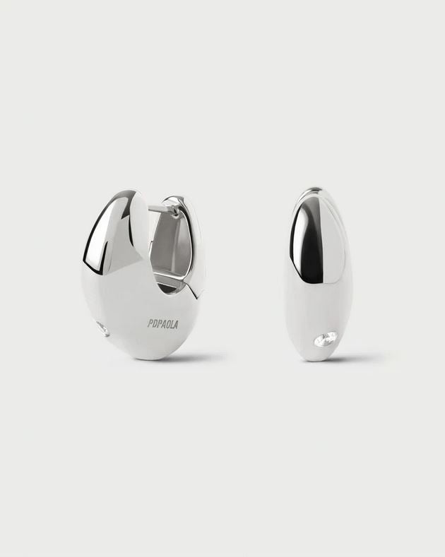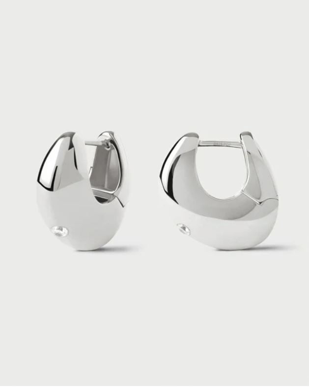 Sculptural silver hoop earrings with asymmetric design adorned with round white zirconia.